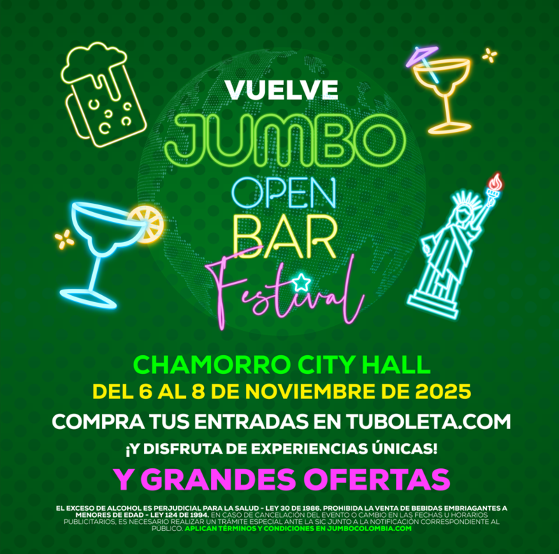 JUMBO OPEN BARChamorro City Hall - Auto Nte. #153-81 from Friday, 7 November 2025 to Saturday, 8 November 2025 Chamorro City Hall - Auto Nte. #153-81 La feria más esperada del año Jumbo Open Bar regresa con una propuesta única. Durante tres días inolvidables, los amantes del buen vivir podrán disfrutar de un recorrido sensorial que reúne lo mejor en licores, vinos, charcutería gourmet y experiencias exclusivas de marca.